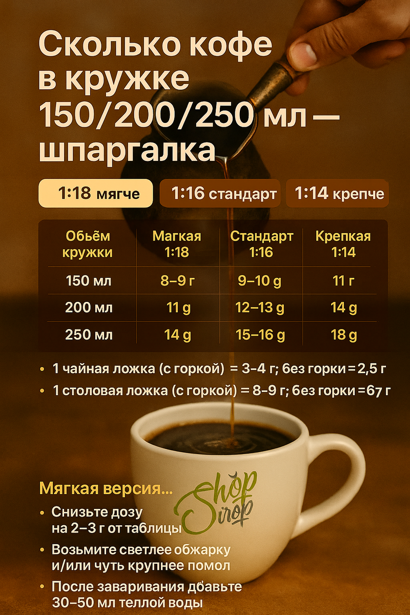 Важно помнить: сосредоточьтесь не на количестве ложек, а на пропорциях. Для домашнего использования удобно запомнить числа 1:18, 1:16 и 1:14, чтобы адаптировать их под свой вкус. Обязательно сохраняйте эту шпаргалку в закладки! Какой режим заваривания предпочитаете вы — мягкий, стандартный или крепкий?