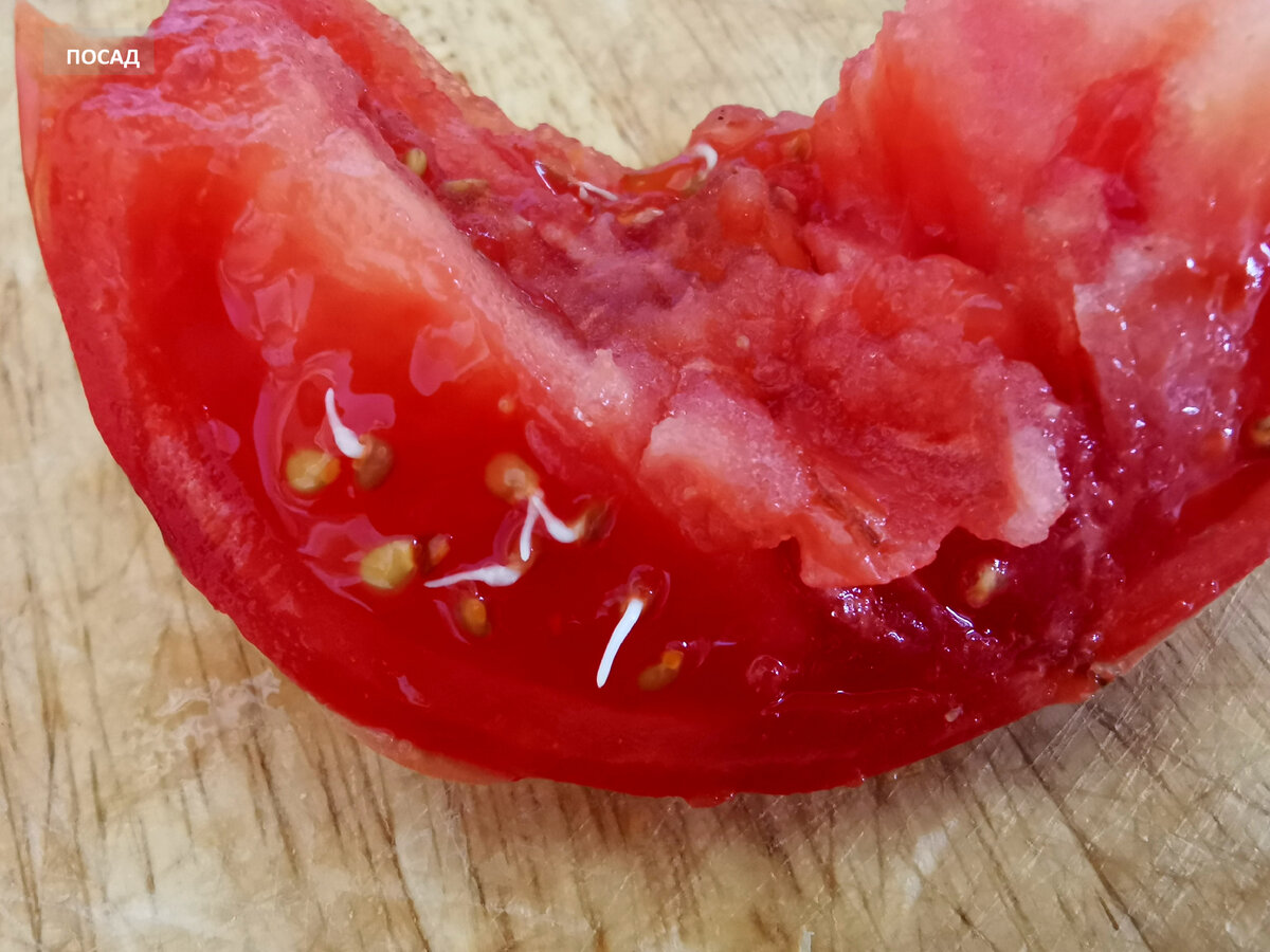 В прошлом году на одном из продуктовых прилавков попался помидор с необычным признаком - он оказался вивипарным, то есть семена начали прорастать прямо внутри плода. Это явление, как правило, связано с нарушениями в условиях хранения, но не стоит паниковать - это не генетическая аномалия.