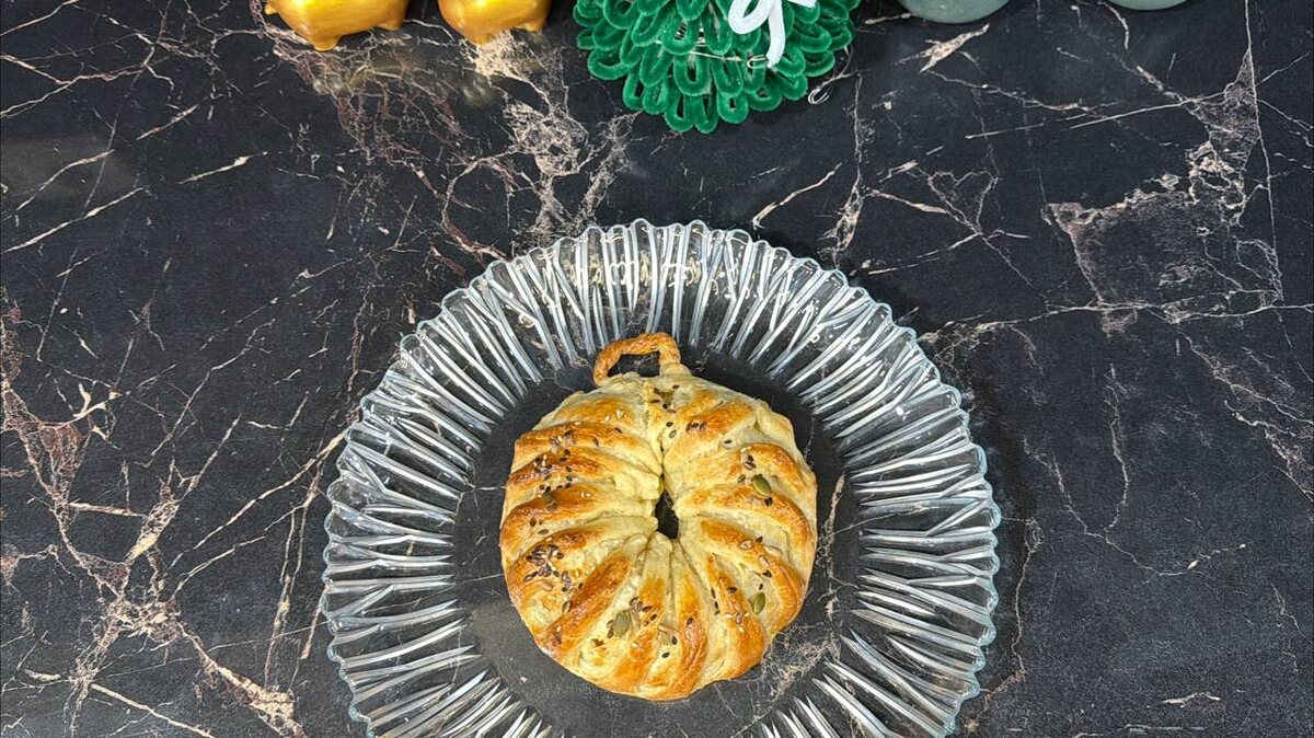 Затем аккуратно заворачивайте тесто, поднимая верхний край к центру и скрывая начинку. Сделайте вертикальные разрезы на оставшемся тесте, чтобы получить тонкие полосочки, которые можно будет изогнуть вверх, придавая венку эффектные складки.