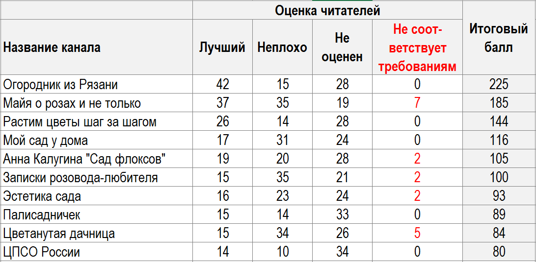 Система оценок была проста: за «лучший» выставлялось 5 баллов, «неплохо» — 1 балл, а отсутствие оценки — 0. Каналы, которые не соответствовали критериям, снижаются в рейтинге на 5 баллов.