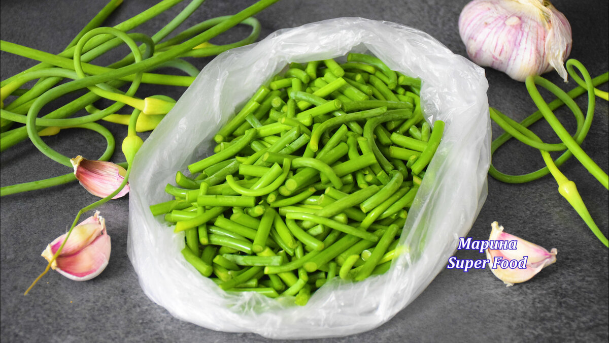 После того как стрелки чеснока подготовлены, их нужно нарезать на маленькие кусочки длиной около 3-4 сантиметров. Эти нарезанные стрелки можно помещать в полиэтиленовые пакеты. Рекомендуется использовать либо один большой пакет, либо разделить их на порции по 100-150 граммов для удобства при использовании.