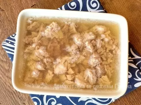- После завершения варки, лапки и мясо извлекаются, а бульон процеживается, избавляясь от остатка жира с помощью бумажного полотенца. Затем мясо разделяется на кусочки и разлаживается в формы, заливая бульоном.