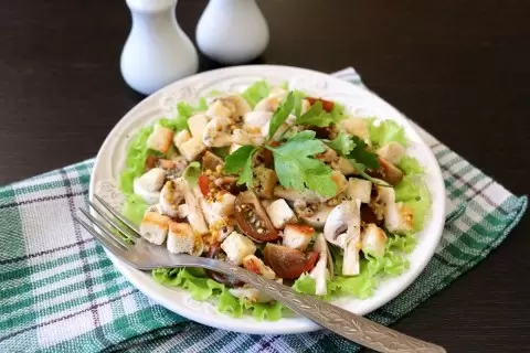 Теперь соберем салат. На красиво оформленную тарелку выложить листья салата, порванные на крупные кусочки. Затем добавьте ломтики шампиньонов и помидоры черри. Далее, одной горсти сухариков будет достаточно — берите любые, которые вам нравятся: черные, серые или белые.