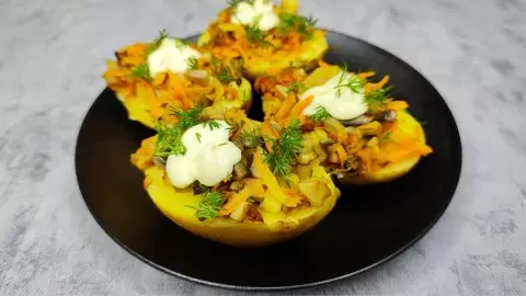 Пока картофель запекается, грибы и лук нарезают, морковь натирают на крупной терке. Обжарьте все ингредиенты на сковороде с добавлением растительного масла в течение 12-15 минут, приправив по вкусу солью и специями. Доставая готовый картофель из духовки, его следует разрезать пополам, а мякоть немного размять, создавая углубление для начинки.