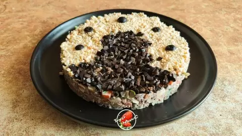 Собрав все компоненты, из лука нужно слить лишний сок и слегка отжать его. Петрушку измельчить и добавить к остальным ингредиентам. В глубокой чаше перемешать все подготовленные составляющие, заправить и выложить на блюдо через специальное кольцо. Сверху украсить салат натертыми желтками и мелко нарезанными маслинами.
