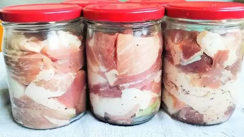 На следующий день готовая тушенка порадует слоем смальца и кусочками мяса, утопающими в аппетитном желе. Это идеальный вариант для сохранения мяса и его длительного хранения без потери питательных свойств.
