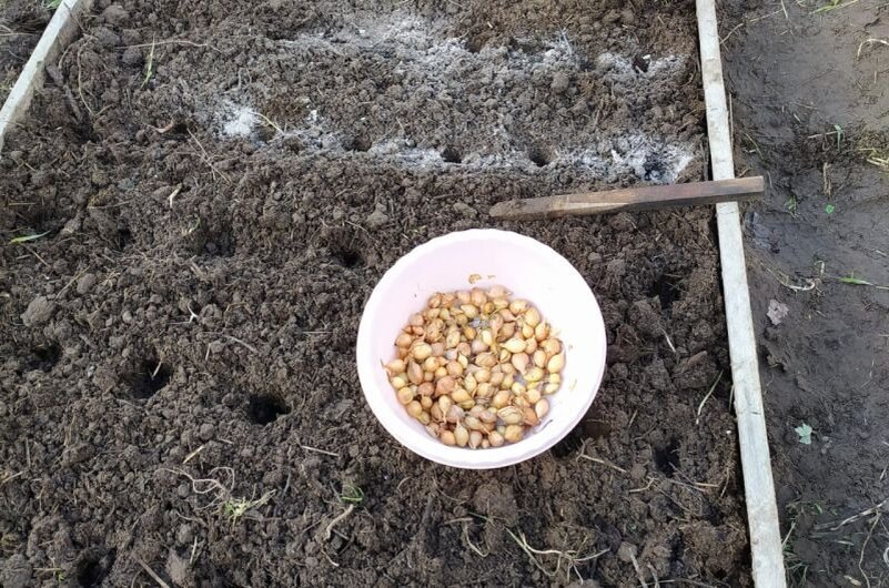 Когда пришло время сажать зубчики, сначала нужно создать углубления в грядке. После этого лучше всего посыпать древесную золу. Именно она является отличным натуральным удобрением, рассматриваемым как безопасное для корней чеснока. Зола не вызывает ожогов, а наоборот, защищает растения от вредителей и улучшает состав почвы, насыщая ее калием и фосфором.